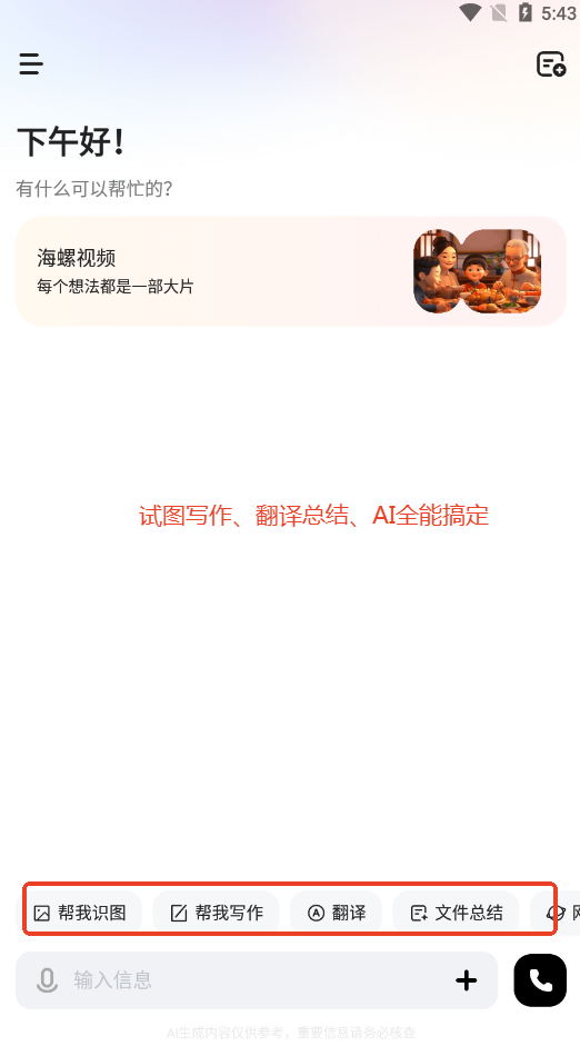 2、使用界面展示MiniMax功能:帮我识图、帮我写作、翻译以及文件总结等。