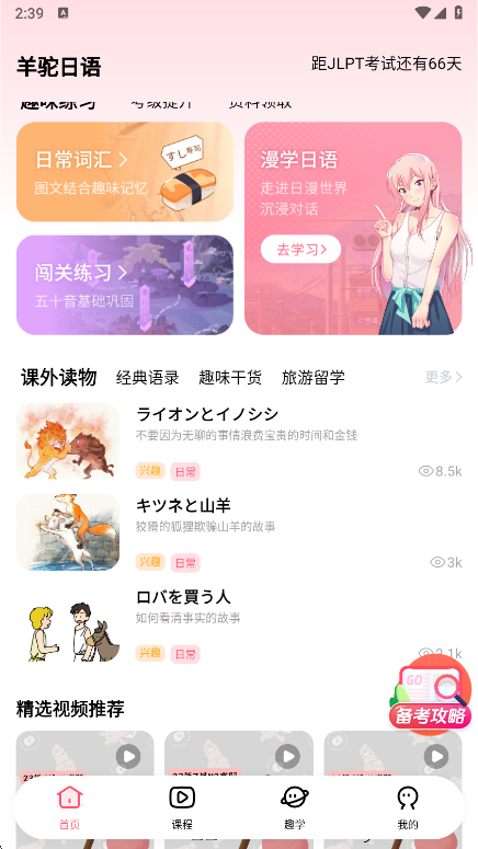 2、在首页中浏览可以查看有关日语学习的所有汇总,包括闯关练习、学习视频等