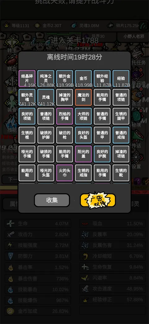 首先,下面的装备可以看到你掉落的装备,这边建议主要看蓝色词条,这个是装备十分重要的地方,我个人优先建议选择有经验加成的词条,然后通过重铸装备把经验拉到20%,达到最大,凑一个全身经验装备,接着抽一个用来打龙或者爬塔的装备,比如技能暴击伤害和攻击速度之类的,最好是想要自己要玩普攻还是技能,单一的走一条路线强点。不要金币反震血量和防御词条,这些在后期完全没用。