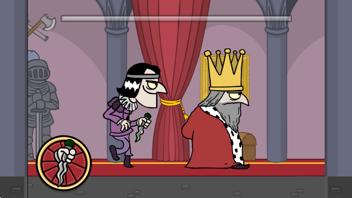 3、你尾随在国王身后,不能在他回头的时候发现你在刺杀,你刺杀的方式需要按住匕首图标,等待上方红条填满