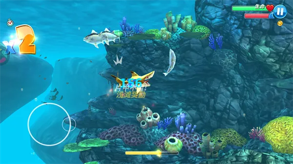 2、屏幕左下角触摸可以操控鲨鱼移动。