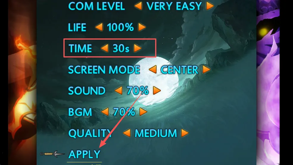 2、在设置菜单中找到“Time”选项,可调整每局比赛的倒计时,默认为60秒