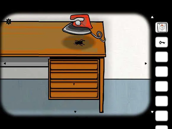4、残忍的一幕要来了,点桌子切换到熨斗场景,点熨斗抬起,在点击小虫让它走过去……