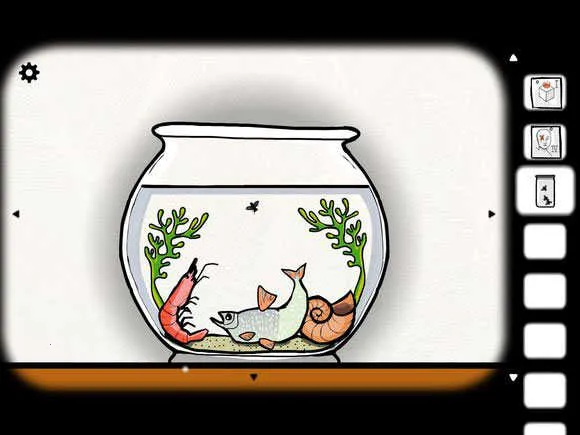 9、点击鱼缸进鱼缸场景,把萤火虫扔进去,点左边水草使萤火虫向右飘进贝壳里,一根手指会顶出点亮萤火虫。再点右边水草使萤火虫飘进鱼嘴里,鱼吃萤火虫后消失,出现钥匙。