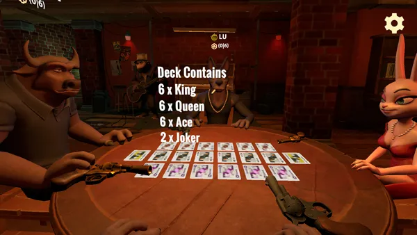 4、玩法多样,充满挑战:有扑克牌玩法和骰子玩法,每种玩法都惊险刺激,考验玩家心理素质与运气,玩家轮流出牌时可选择翻牌,若牌不对则对方需对自己开枪,每局决出胜利者。