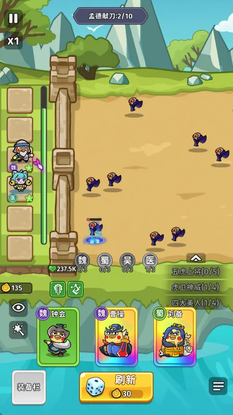 这款游戏将三国题材与塔防玩法相融合,采用可爱Q版画风,名将形象讨喜。设有魏蜀吴医四大阵营,玩家能收集武将自由组建卡组,还有预设卡组功能可灵活调整阵容。抽卡塔防模式有趣,丰富的羁绊效果能大幅提升队伍战斗力。比如集齐刘备麾下五虎上将就能激活超强羁绊。在战斗中,依据阵营选择武将很关键,凑齐一定数量同阵营武将可最大化提升战斗力。游戏内还有稀有装备掉落,能增强角色属性,整体玩法丰富多样,值得一玩。