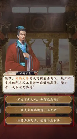 2、首先是上朝,随机点击兵部、礼部等上书奏折,根据选择来获取/减少声望、政务。