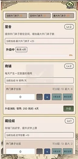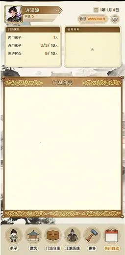 武林门派模拟器2026最新版本是一款文字模拟经营游戏。可打造门派,广收弟子,提升声望。培养内外门弟子实力,建造多种建筑,发布任务派弟子外出工作,历经江湖风云,从弱小门派成长为武林大派。